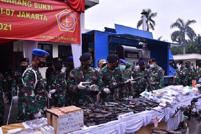 Jakarta-mediaindonesianews.com: Tentara Nasional Indonesia (TNI) melaksanakan pemusnahan berbagai jenis barang bukti perkara tindak pidana militer dengan tetap menjalankan protokol kesehatan Covid-19, bertempat di halaman kantor Oditur Militer II-07 Jakarta, Jl. Dr. Soemarmo Pulogebang, Jaktim, Jumat (19/3).